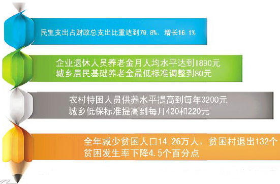 民生支出占財政總支出比重達到79.8%,增長16.1%。省定16件重點民生實事和市定6件惠民實事全面完成。企業退休人員養老金月人均水平達到1890元,城鄉居民基礎養老金最低標準調整到80元,醫療保險實現并軌。農村特困人員供養水平提高到每年3200元,城鄉低保標準提高到每月420和220元。全年減少貧困人口14.26萬人,貧困村退出132個,貧困發生率下降4.5個百分點?!八母淖摺碑a業扶貧模式在全國推介。扶貧小額貸款發放超20個億,全省第一?!?/p>