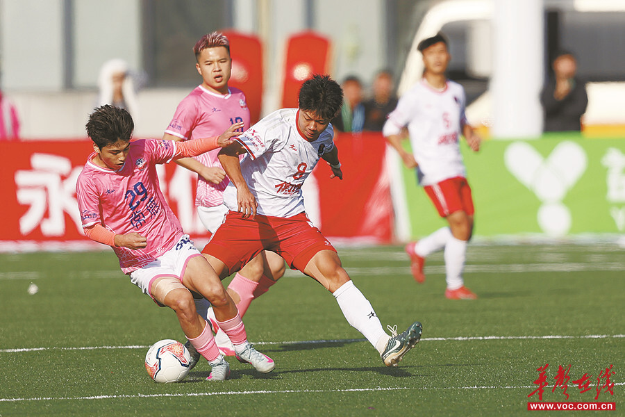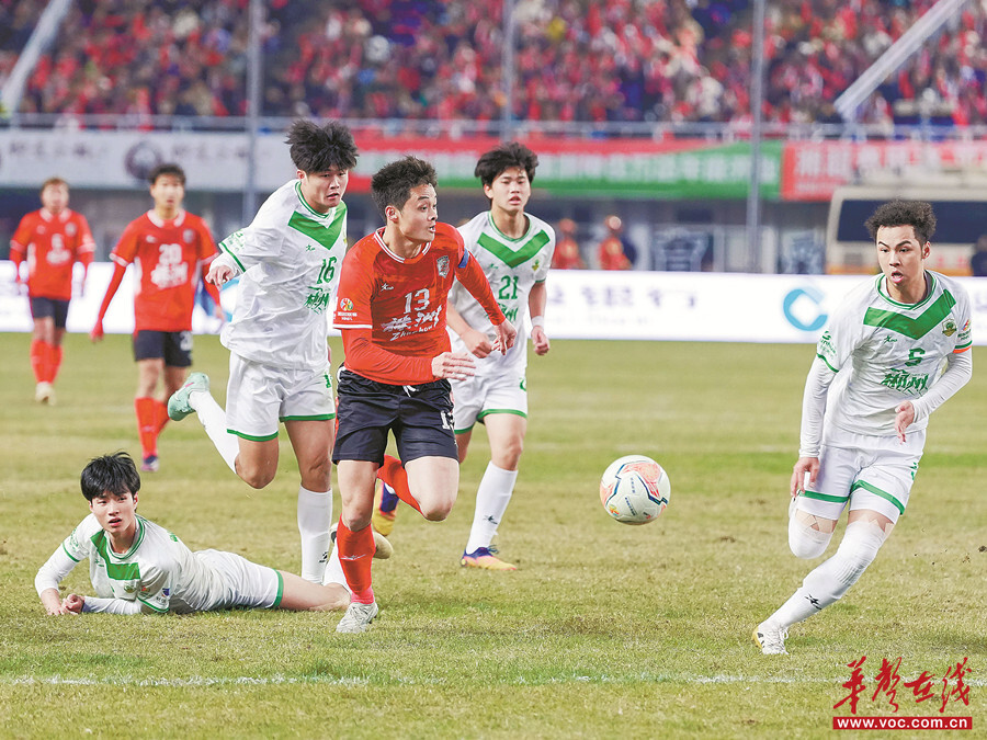 ?12月14日晚,長沙賀龍體育場,球員在比賽中激烈拼搶。當天,2025湘超聯賽淘汰賽首輪戰火燃爆!長沙隊(紅)主場迎戰岳陽隊,最終以2比0戰勝岳陽隊,與常德、永州、株洲三支球隊攜手挺進四強。本組照片為華聲在線全媒體記者郭立亮及通訊員攝