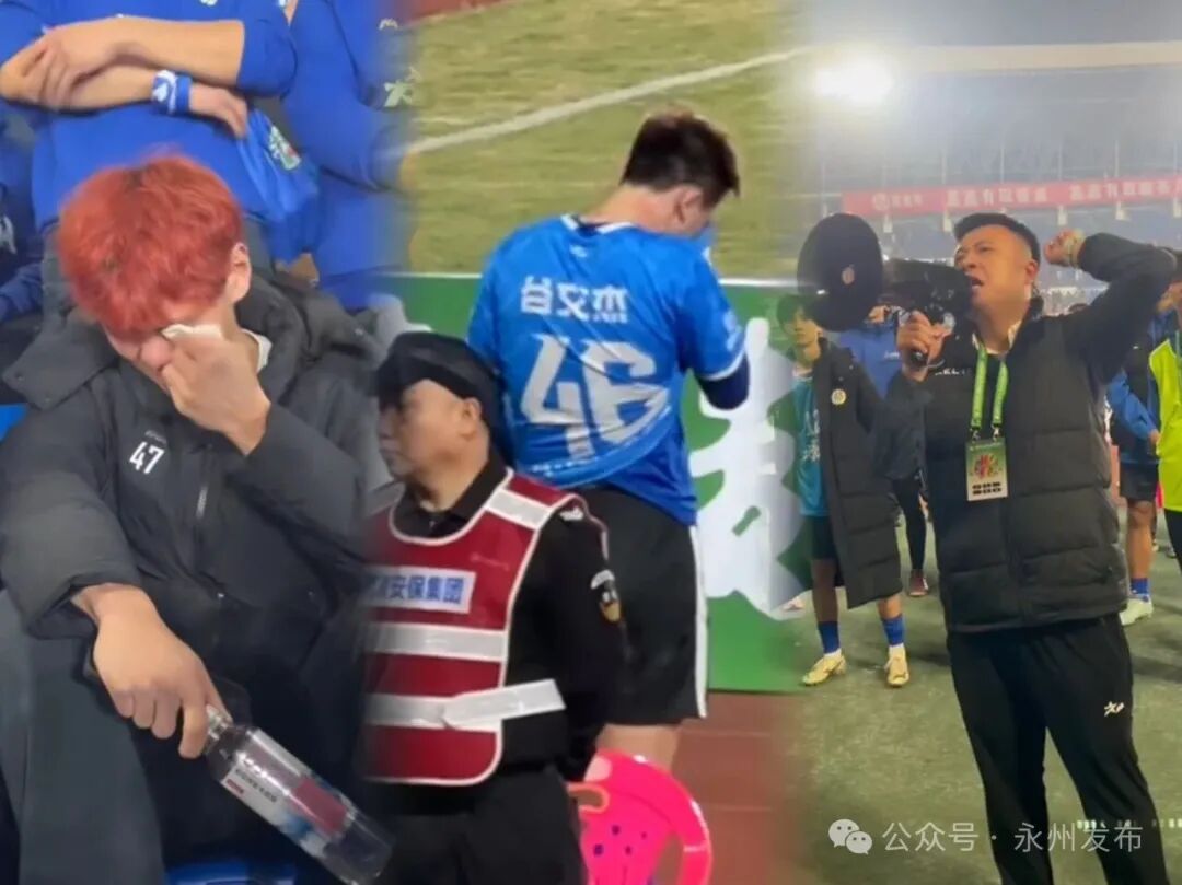 賽后的球迷致謝環節,一米九三的谷文杰站在球場的角落,用衣角一遍遍擦拭著奪眶而出的淚水。剛從外省奔波歸來的門將唐嘉年眼眶泛紅,高響、張華越兩位主力球員的舊傷仍在隱隱作痛,可他們目光始終堅毅——因為孩子們知道,身后站著的是他們親愛的家人們。主教練黃楚儒聲音嘶啞,面對看臺上那片久久不肯離去的“永州藍”,哽咽卻堅定地說:“下一場,我們肯定會繼續回來的!”這不是一句口號,而是一支球隊對這座城市的熱愛,是一群孩子們對家鄉親人的誓言。