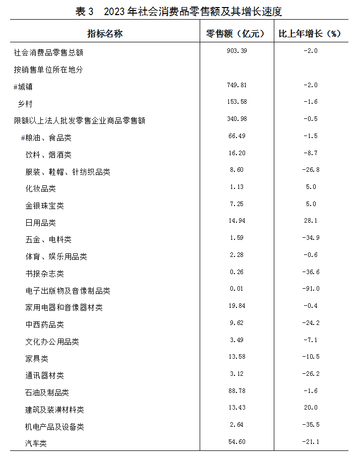 全年社會(huì)消費(fèi)品零售總額903.39億元,比上年下降2.0%。分經(jīng)營(yíng)地看,城鎮(zhèn)消費(fèi)品零售總額749.81億元,下降2.0%;鄉(xiāng)村消費(fèi)品零售總額153.58億元,下降1.6%。