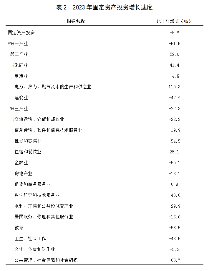 全年固定資產(chǎn)投資比上年下降5.9%。分經(jīng)濟(jì)類型看,國(guó)有投資下降27.0%,民間投資下降0.3%。分投資方向看,工業(yè)投資增長(zhǎng)22.3%,民生投資下降33.5%,生態(tài)投資下降4.3%,基礎(chǔ)設(shè)施投資下降29.2%,高新技術(shù)產(chǎn)業(yè)投資增長(zhǎng)1.3%,工業(yè)技改投資下降19.2%。