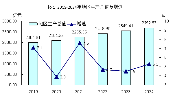 初步測算,全年全市地區生產總值[2]2692.57億元,比上年增長5.3%。其中,第一產業469.34億元,增長3.0%,第二產業888.58億元,增長6.1%,第三產業1334.65億元,增長5.7%。人均地區生產總值53346元,增長6.6%。