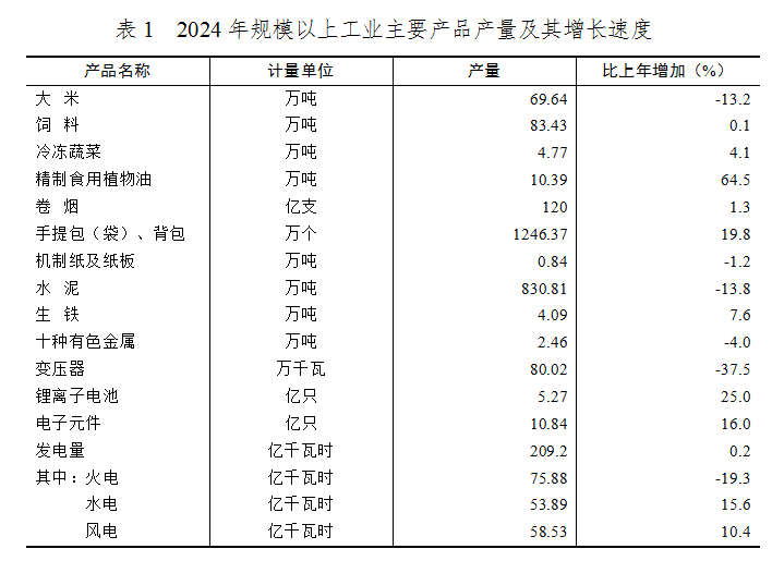 分行業看,黑色金屬冶煉和壓延加工業,鐵路、船舶、航空航天和其他運輸設備制造業,化學原料和化學制品制造業增加值分別增長45.1 %、35.8 %、13.7 %。分產品看,全市全年規模以上工業統計的產品中,精制食用植物油10.39萬噸,增長64.5 %;鋰離子電池5.27億只,增長25.0 %;手提包背包1246.37萬個,增長19.8 %;電子元件10.84億只,增長16.0 %;生鐵4.09萬噸,增長7.6 %;發電量209.2億千瓦時,增長0.2 %,其中火電75.88億千瓦時,下降19.3 %,水電53.89億千瓦時,增長15.6 %,風電58.53億千瓦時,增長10.4 %。
