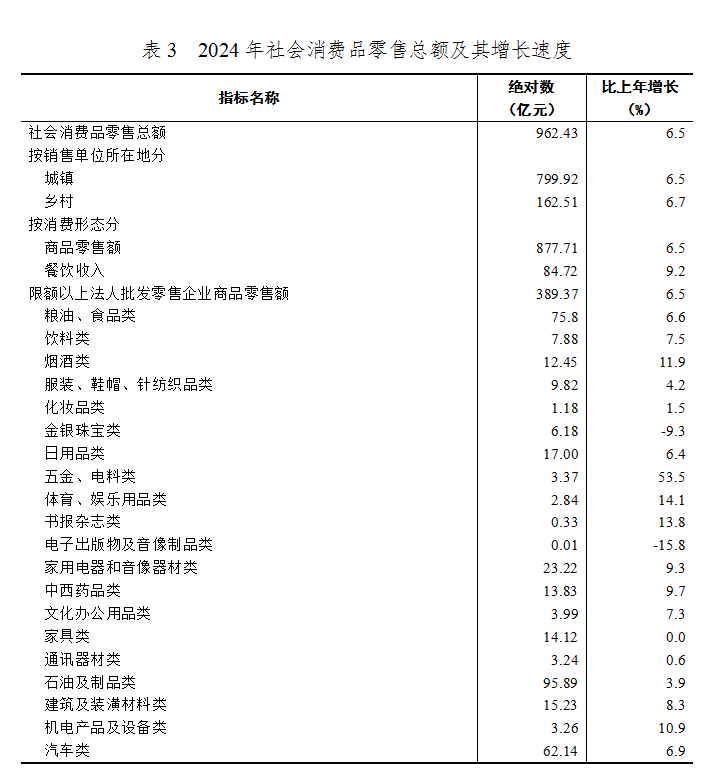 全年社會消費品零售總額[7] 962.43億元,比上年增長6.5 %。分經營地看,城鎮消費品零售總額799.92億元,增長6.5 %;鄉村消費品零售總額162.51億元,增長6.7 %。