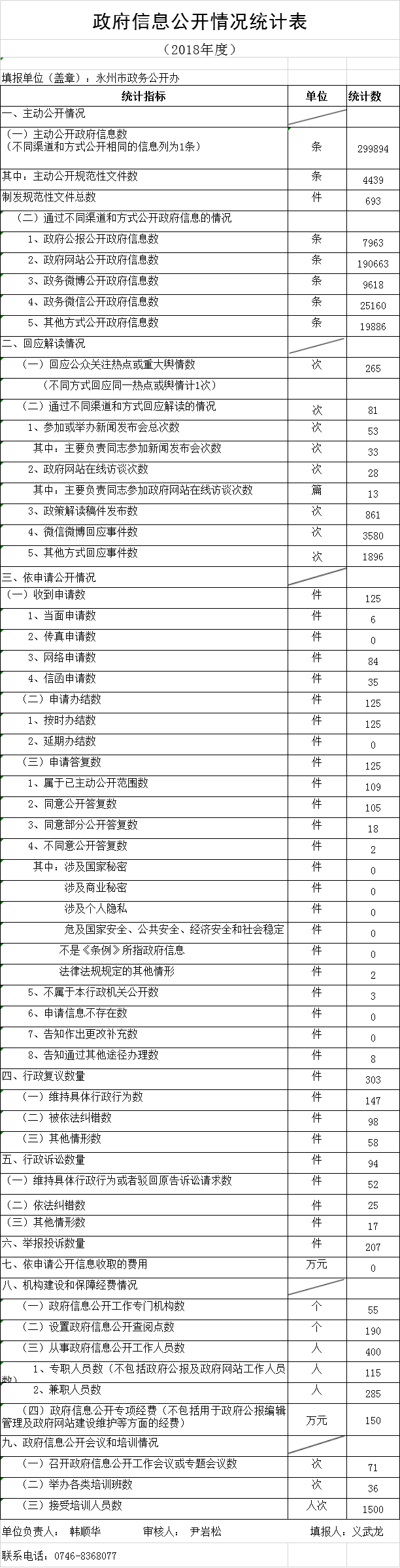 編制說明:本年度報告由永州市政務公開領導小組辦公室編制。內容包括:概述,主動公開,回應關切,政策解讀,制度建設,依申請公開,行政復議、訴訟和申訴,政府信息公開的收費及減免,機構建設和經費保障,政府信息公開會議和培訓等情況,存在的主要問題和改進措施,附表十部分組成。本年度報告中所列數(shù)據(jù)的統(tǒng)計期限自2018年1月1日起至2018年12月31日止。