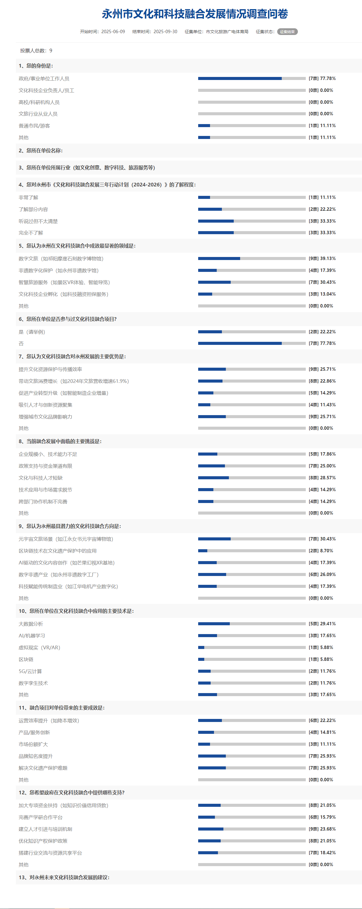 關于永州市文化和科技融合發展情況的調查問卷自2025年6月9日開始,至2025年9月30日結束,投票人數9人,具體情況見下圖統計: