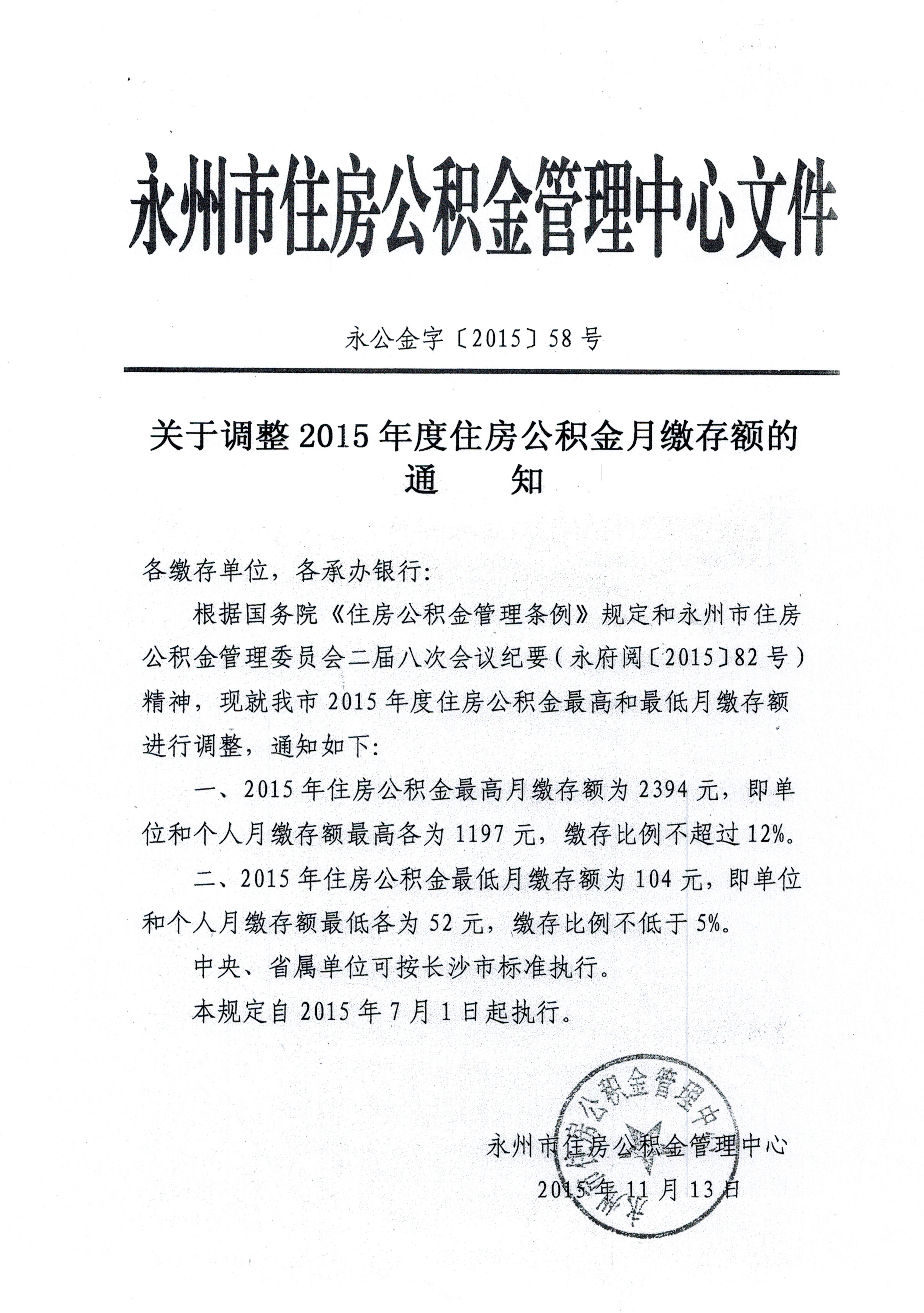 關(guān)于調(diào)整2015年度住房公積金月繳存額的通知