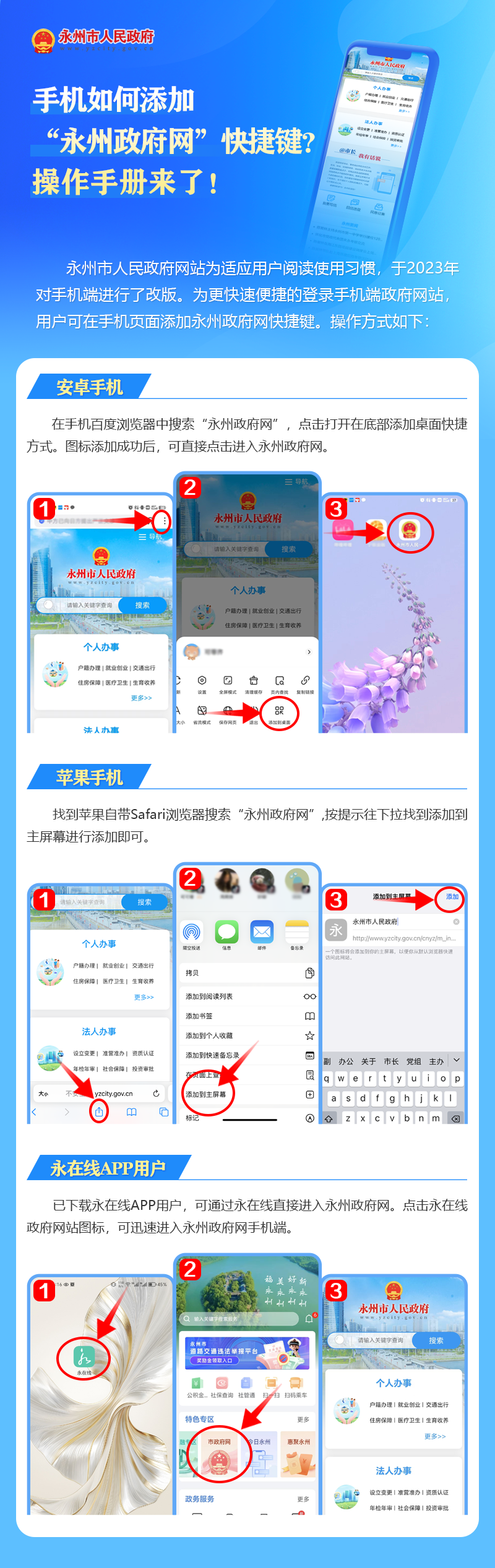 答:為更快速便捷的在手機端登錄永州市人民政府門戶網(wǎng)站,用戶可在手機頁面添加永州政府網(wǎng)快捷鍵。操作方式如下: