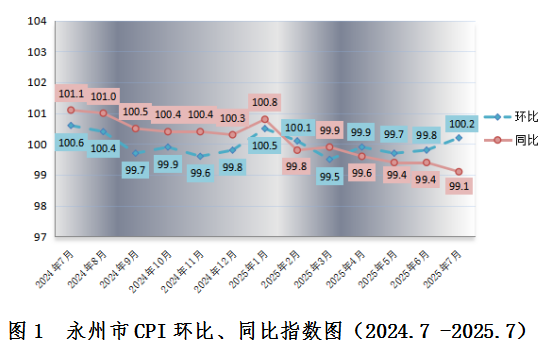 2025年7月份,食品供應(yīng)總體充足,永州居民消費(fèi)價(jià)格(CPI)同比價(jià)格下跌0.9%,環(huán)比價(jià)格上漲0.2%。