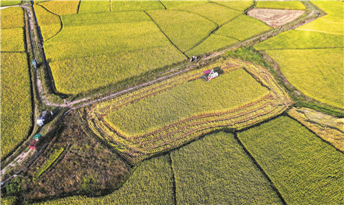 近日,新田縣新圩鎮上禾塘村村民駕駛收割機在田間收獲晚稻。金秋時節,新田縣晚稻陸續成熟迎來豐收季,當地農民搶抓晴好天氣開展收割作業,確保糧食顆粒歸倉。劉貴雄 攝