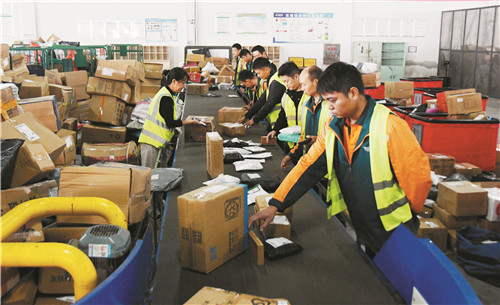 “雙十一”期間,我市各地快遞物流企業結合實際情況,通過智能系統升級、人力調配優化等措施,確??爝f物流高效運行,全力應對電商購物高峰期。圖為中國郵政集團有限公司江永縣分公司郵件處理中心,工作人員正在流水線上分揀快遞包裹。 田如瑞 攝