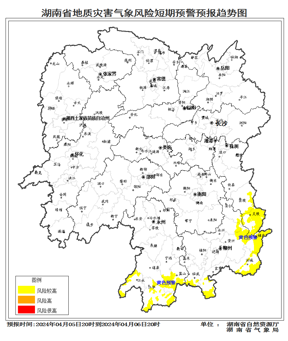 根據地質災害成災規律和孕災條件,結合202445日短期氣象預報情況,省自然資源廳與省氣象局聯合會商得出如下結論:自4520:00620:00,受降雨影響,湘東南、湘南大部分區域發生突發性地質災害風險較高(黃色預警)。