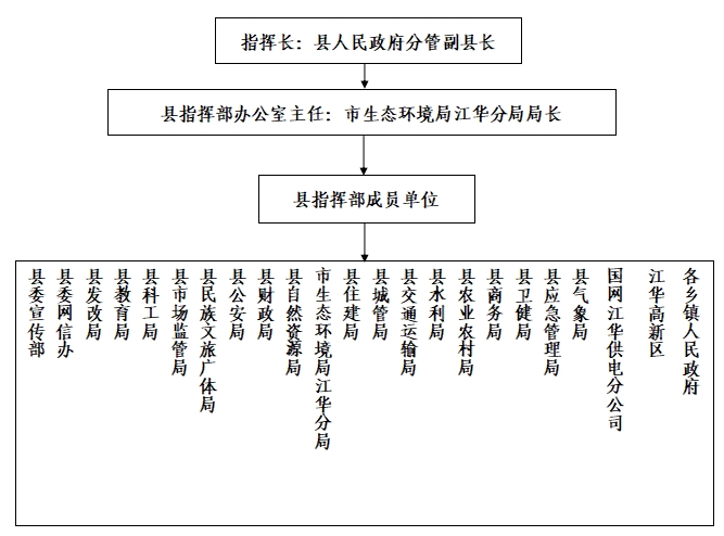 指揮部指揮長(zhǎng)由縣人民政府分管生態(tài)環(huán)境工作的副縣長(zhǎng)擔(dān)任;副指揮長(zhǎng)由縣人民政府辦公室協(xié)助管理生態(tài)環(huán)境工作的副主任和市生態(tài)環(huán)境局江華分局局長(zhǎng)、縣氣象局局長(zhǎng)擔(dān)任。