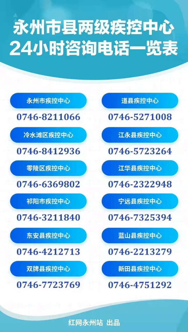 永州市縣兩級疾控中心24小時咨詢電話一覽表和各鄉鎮(街道)值班電話(截至2022年3月6日)