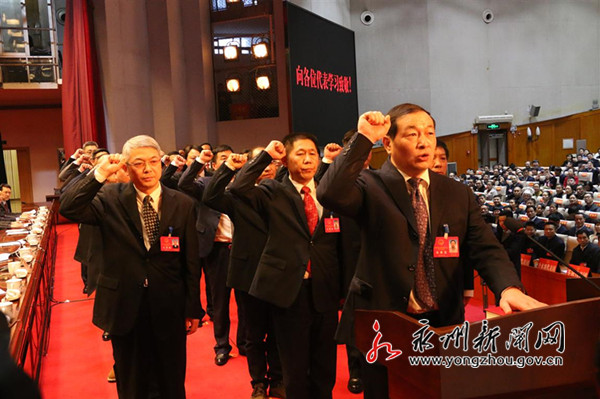 會上,永州市人大常委會秘書長蔣千紅帶領新當選人員向憲法莊嚴宣誓。