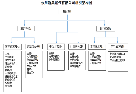 永州新奧燃氣有限公司成立于2011年9月13日,是隸屬于新奧能源控股有限公司(股票代碼02688.HK)的全資子公司,經營范圍:從事管道燃氣設施、設備的建設、安裝、維護;燃氣輸配;燃氣的生產和銷售;燃氣設備與燃氣器具的生產、銷售、安裝、檢測和維修服務;加氣站的建設、經營;人工勞務(對外勞務合作經營除外);注冊資金一億元,擁有政府授予的永州市管道燃氣三十年特許經營權。公司辦公樓位于冷水灘區永州大道與城南大道交匯處金葉怡馨家園6棟107-108號。目前擁有兩個營業廳,分別為河東營業廳(地址:冷水灘區湘永路華鹽大酒店西側),河西營業廳(地址:冷水灘區零陵北路佰樂福二樓)。為廣大用戶提供燃氣報裝、開通、維修、咨詢、燃氣具銷售等服務。公司總經理仲昭華,公司設五部一室,具體見組織架構圖。