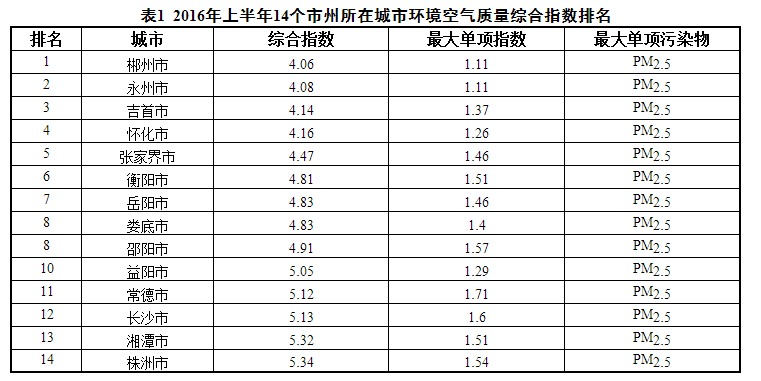 按照城市環境空氣質量綜合指數評價,2016年上半年空氣質量相對較好的是郴州市,相對較差的是株洲市。