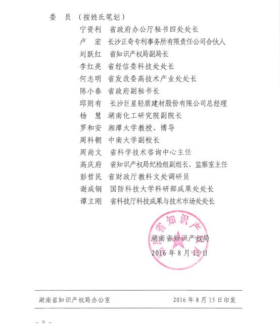 湘知發〔2016〕55 號湖南省知識產權局關于調整湖南省專利獎獎勵委員會組成人員的通知