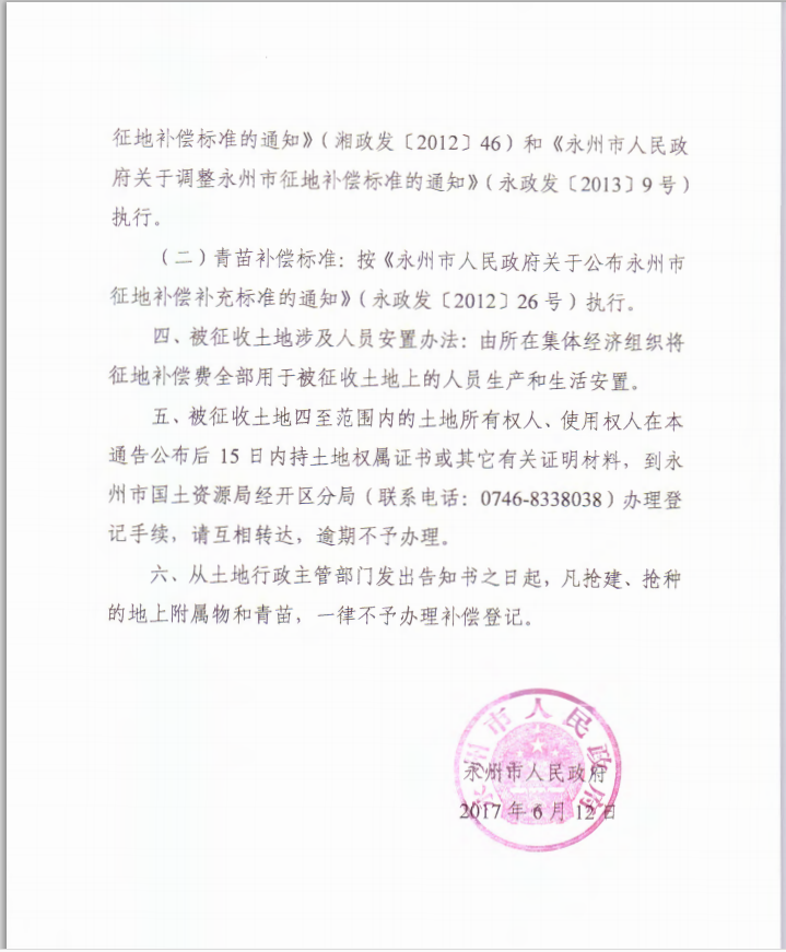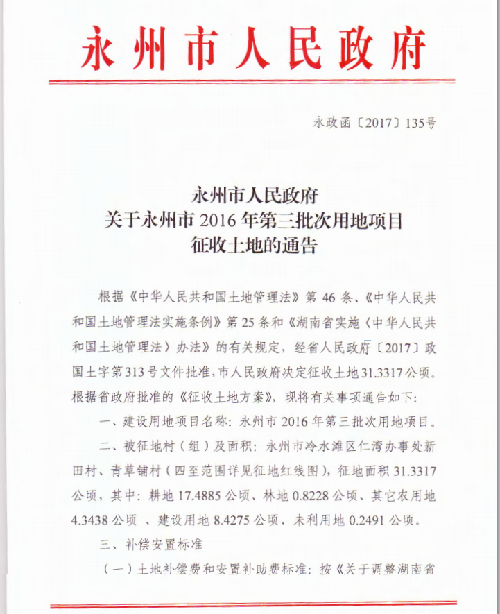 永州市人民政府關(guān)于永州市2016年第三批次用地項(xiàng)目征收土地的通告