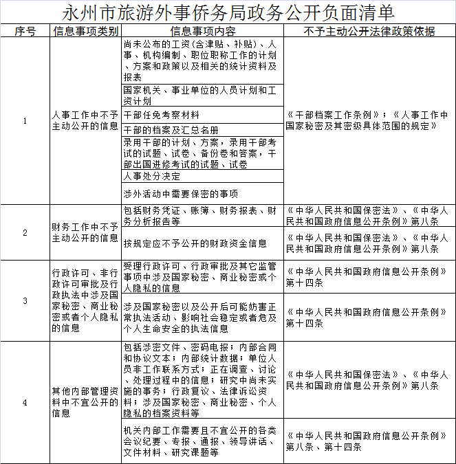 為貫徹落實《國務院辦公廳關于做好政府信息依申請公開工作的意見》、《中共永州市委辦公室 永州市人民政府辦公室印發<關于全面推進政務公開工作的實施意見>的通知》(永辦發〔2016〕37號)要求,根據相關法律、法規和國務院、省政府有關文件,以下事項列入永州市旅游外事僑務局政務公開負面清單: