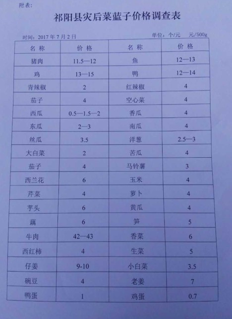 7月1—2日,祁陽縣遭受洪災(zāi)侵襲,這次洪水已超過歷史最高水位88.51米,達(dá)到89.08米。這次洪災(zāi)對全縣蔬菜造成了很大的損失,全縣蔬菜(各類)受災(zāi)面積11.2萬畝,成災(zāi)面積9.7萬畝,絕收面積3.2萬畝,由于德輝、天之龍、百蔬園、大自然等大型蔬菜基地,都在湘江河或小河邊,這次損失慘重。7月2日,縣農(nóng)業(yè)信息站到農(nóng)貿(mào)市場進(jìn)行調(diào)查(見附表),通過這次調(diào)查發(fā)現(xiàn)雞、鴨、魚、肉等肉類產(chǎn)品價格與災(zāi)前基本持平,瓜果類價格上漲10%左右,葉菜價格每500克增加1—2元。由于湘江水位退水速度緩慢,基地原有的蔬菜部分被水沖走,大部分會爛在地上。因此,要快速開展生產(chǎn)自救,種植速生菜,補(bǔ)給市場、抑制菜價,同時要從受災(zāi)較輕的地區(qū),調(diào)劑蔬菜,彌補(bǔ)蔬菜短缺,確保蔬菜市場價格穩(wěn)定,并要加強(qiáng)市場監(jiān)管,狠狠打擊欺行霸市的行為,維護(hù)社會穩(wěn)定。