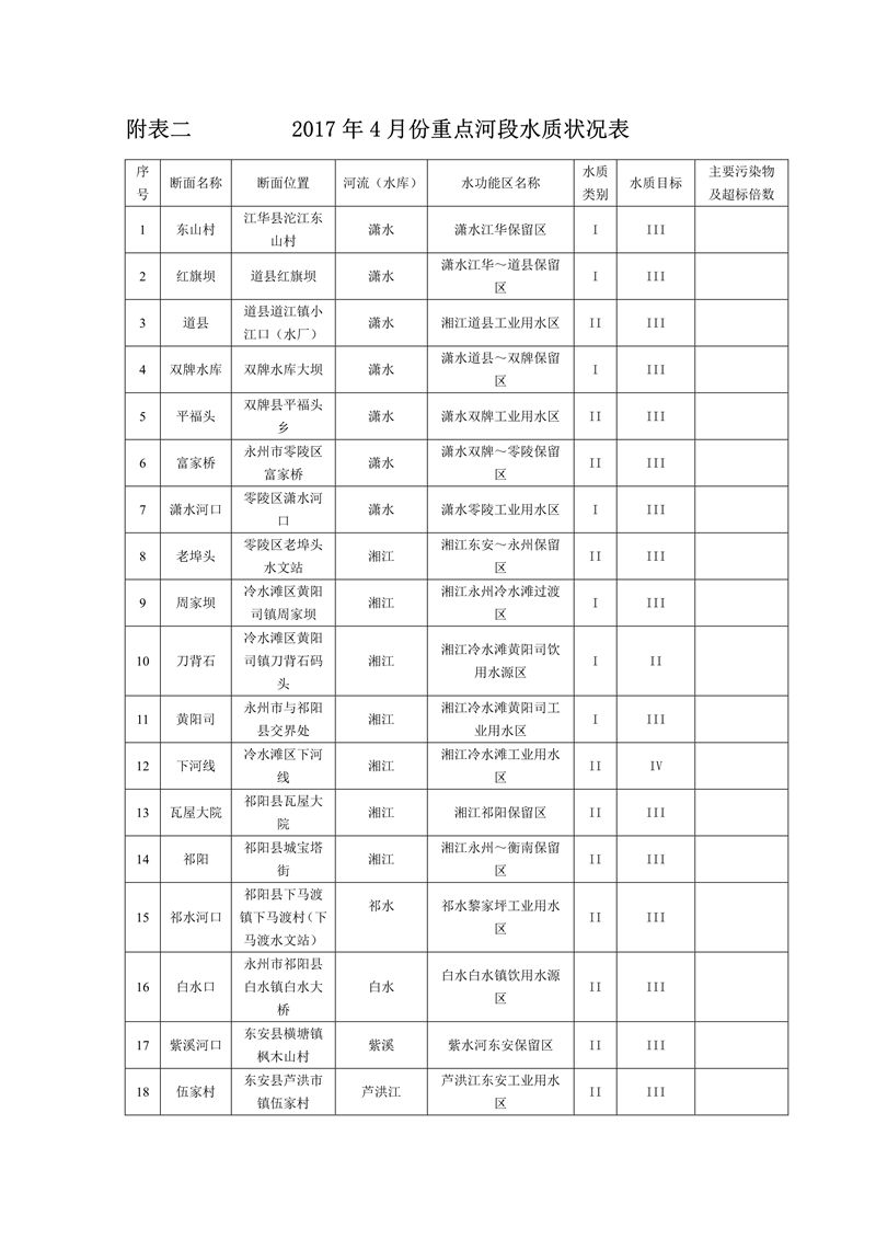 2017年4月永州市水資源質量狀況通報