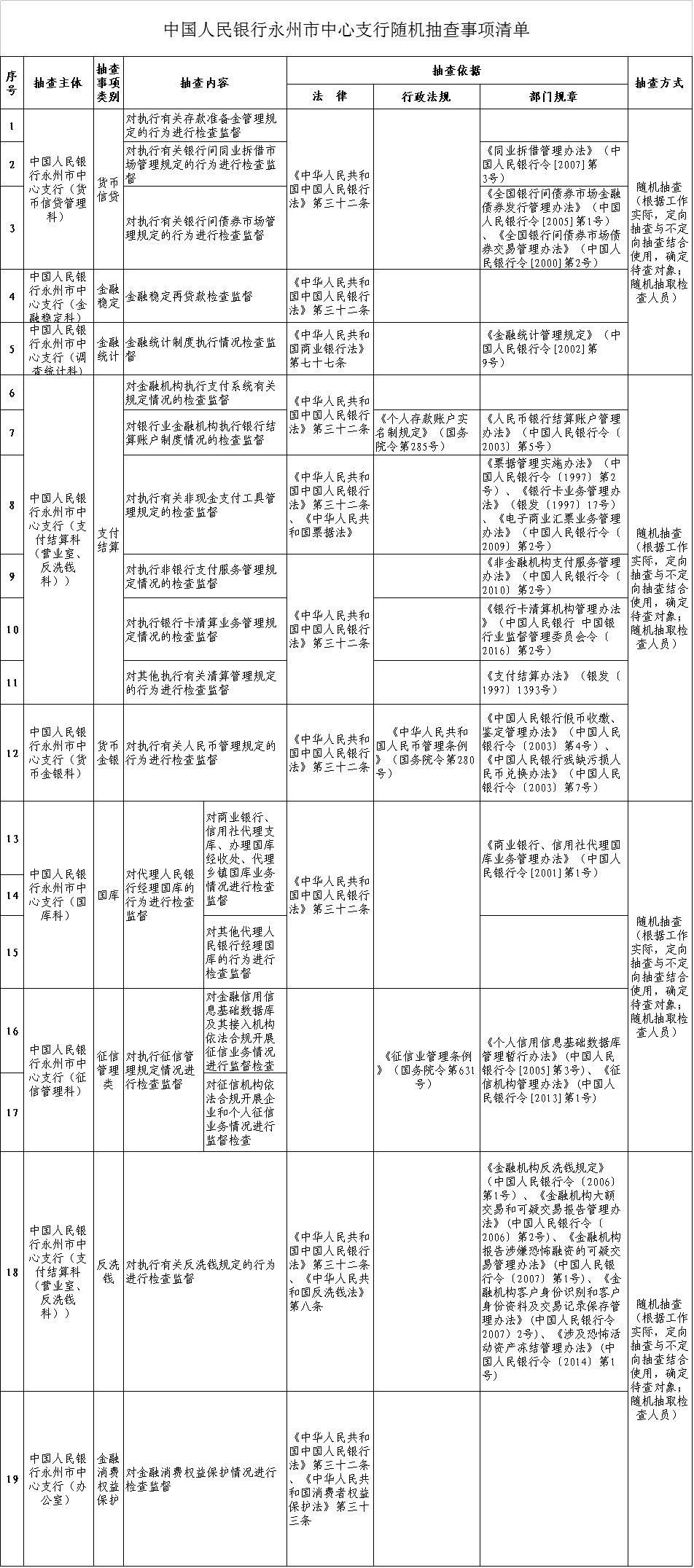 中國人民銀行永州市中心支行隨機抽查事項清單