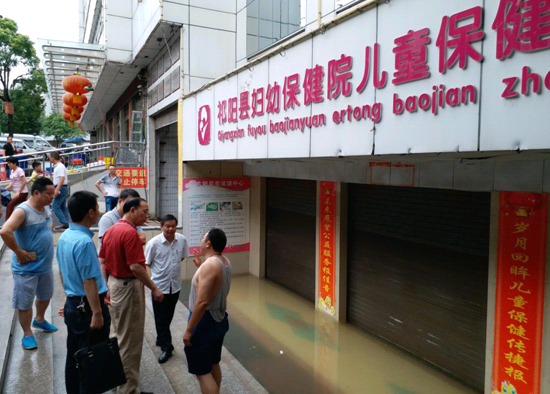 歐陽德群在祁陽縣疾病預防控制中心會議室了解祁陽災情后,便立即趕往現場走訪查看。重點查看了一樓己被淹沒的祁陽縣婦幼保健院,在了解當前所采取的防災措施后,他提出,新生兒監護、現有病人救治如果現有條件不能滿足需要,要立即聯系其它醫療機構進行轉移,必須確保人員安全。