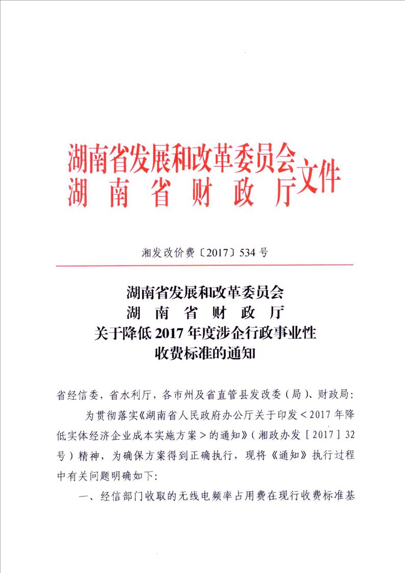 湘發改價費〔2017〕534號 省發改委 省財政廳關于降低2017年度涉企行政事業性收費標準的通知