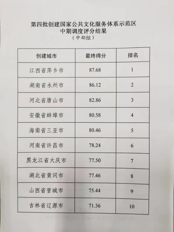 9月17-18日,國家文旅部在北京中央文化和旅游管理干部學院舉辦了第四批創(chuàng)建國家公共文化服務體系示范區(qū)(項目)中期調(diào)度工作培訓班。市委常委、宣傳部長、市創(chuàng)建辦主任賀輝率市創(chuàng)區(qū)工作組一行人等前往匯報創(chuàng)建工作。經(jīng)國家專家組打分評議,綜合前期第三方設施暗訪和群眾滿意度測評,在河北省唐山市、山西省晉城市、吉林省遼源市、黑龍江省大慶市、安徽省蚌埠市、江西省萍鄉(xiāng)市、河南省許昌市、湖北黃岡市、海南省三亞市等中部組10個創(chuàng)建城市中,永州以排名第2的優(yōu)秀成績,順利通過國家文旅部的中期調(diào)度,為明年最終驗收達標奠定了堅實基礎。